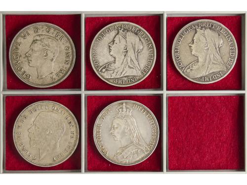 GRAN BRETAÑA. Lote 5 monedas Crown. 1889, 1898, 1900, 1935 y 1937. VICTORIA (3), GEORGE V y GEORGE VI. A EXAMINAR. KM-765, 783, 842, 857. MBC- a EBC-.
