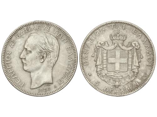 GRECIA. 5 Drachmai. 1876-A. GEORGE I. PARÍS. 24,67 grs. (Leves oxidaciones limpiadas). KM-46. MBC+.