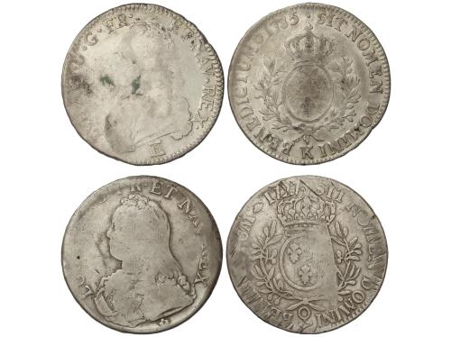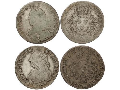 FRANCIA. Lote 2 monedas Ecu. 1729-D y 1780. LOUIS XV y XVI. LYON y BEARN (Buey). (La de 1780 rayitas). Dav-1330 y 1334; KM-486, 6 y 572. BC y MBC-.