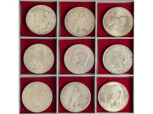 ESTADOS UNIDOS. Lote 9 monedas 1 Dollar. 1922 a 1974. PHILADELPHIA y SAN FRANCISCO. Incluye 6x Dollar tipo Peace: 1922, 1923, 1924S, 1925, 1926 y 1935S. 3x Dollar tipo Eisenhower: 1971S, 1972S y 1974S. A EXAMINAR. KM-150, 203a. MBC+ a SC.