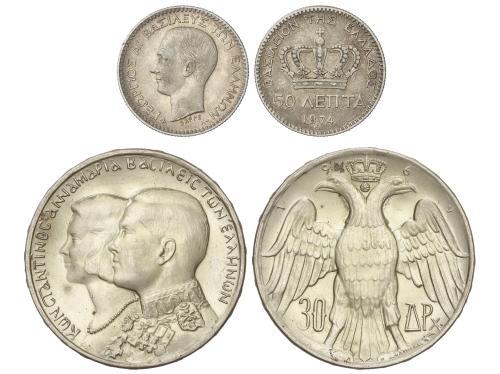 GRECIA. Lote 2 monedas 50 Lepta y 30 Drachmai. 1874 y 1964. KM-37, 87. MBC y EBC+.