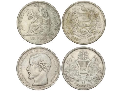 GUATEMALA. Lote 2 monedas 1 Peso. 1866-R y 1894-H. 24,29 y 24,79 grs. (La de 1866 golpecitos en gráfila). KM-186.1 y 210. MBC y MBC+.