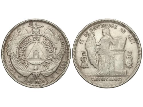 HONDURAS. 1 Peso. 1892/0. 24,83 grs. (Hojita en anverso). KM-52. MBC.