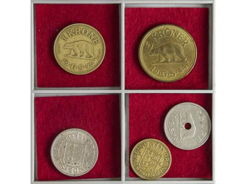 GROENLANDIA. Lote 5 monedas 25 (2) y 50 Ore, 1 y 5 Kroner. 1926 y 1944. KM-6/9. MBC a EBC.