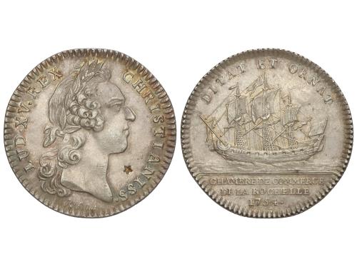 FRANCIA. Jetón. 1754. LUIS XV. CHAMBRE DE COMMERCE DE LA ROCHELLE. 6,65 grs. Ø 30 mm. Pequeña contramarca estrella de 5 puntas en anverso. EBC.