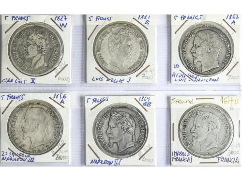 FRANCIA. Lote 6 monedas 5 Francs. 1827 a 1870. PARÍS (3), LILLE, ROUEN y STRASBOURG. Todas diferentes. A EXAMINAR. KM-728.13, 735.2, 773.1, 782.1, 799.2 y 799.1. MBC- a MBC+.