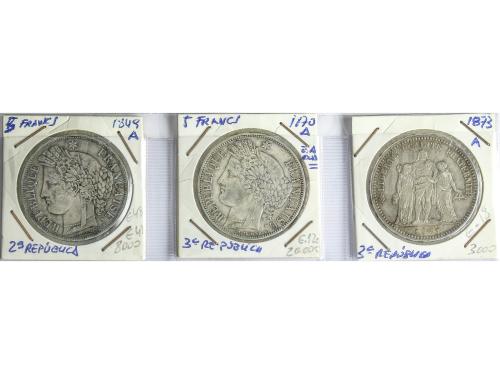 FRANCIA. Lote 3 monedas 5 Francs. 1849-A, 1870-A y 1873-A. II y III REPUBLIQUE. PARÍS. KM-761.1, 818, 1 y 820.1. MBC+ a EBC-.