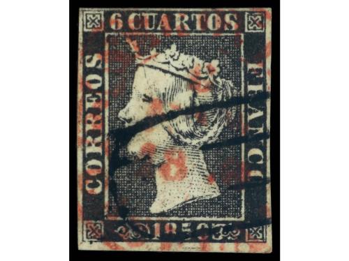 ° ESPAÑA. Ed. 1. 6 cuartos negro TIPO I, posición 24. Sello con doble matasellos (fechador y PARRILLA DE MADRID). PRECIOSO. MUY RARO.